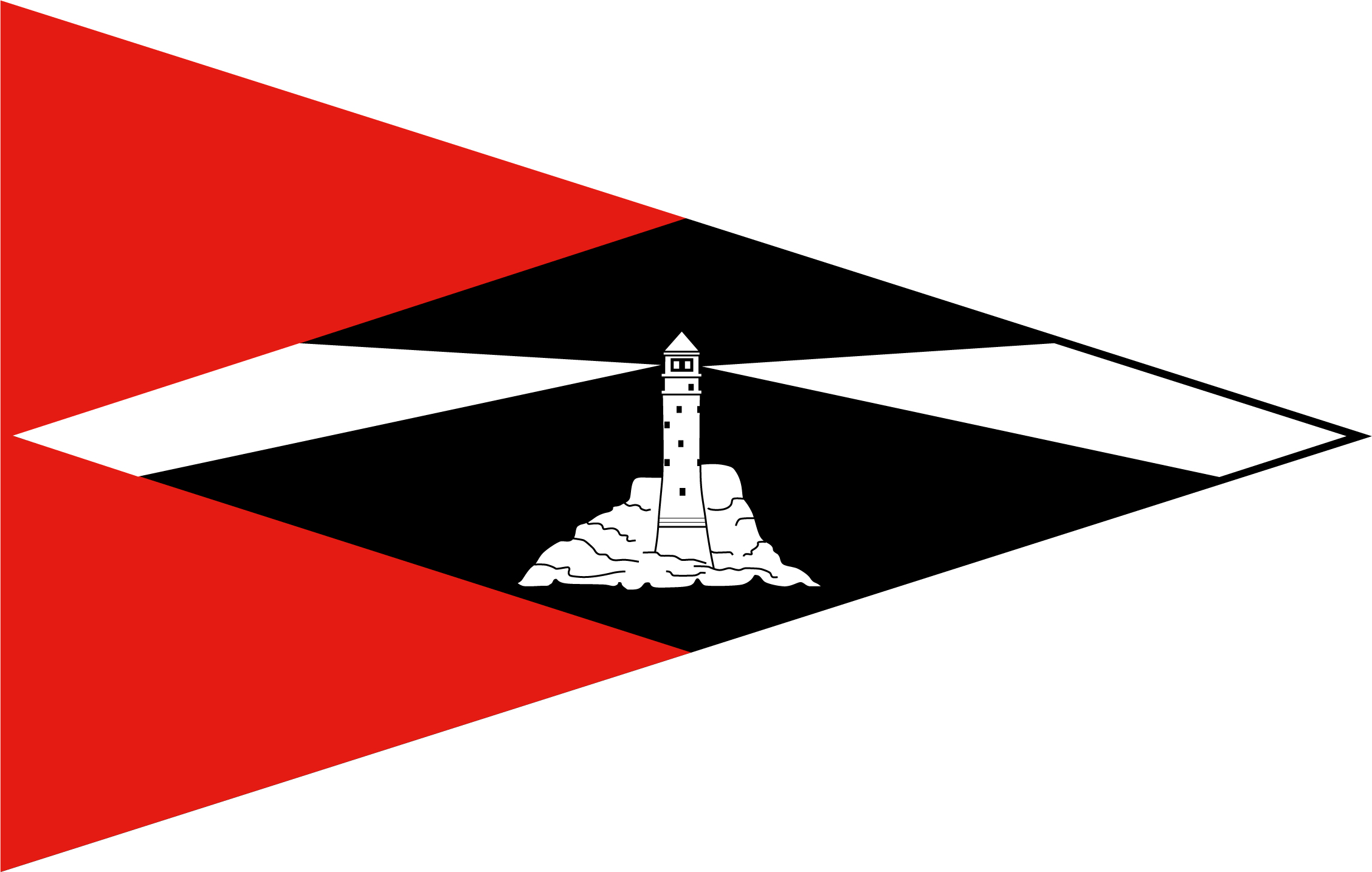 (i). The Club Burgee shall be triangular, black in colour, with a red triangle in each of the first and third quarters, having in the centre a white device representing the Fastnet Rock and lighthouse showing beams, in accordance with its traditional design. The Burgee may only be flown at the main masthead of a vessel under the command of a member, including an honorary or temporary member.